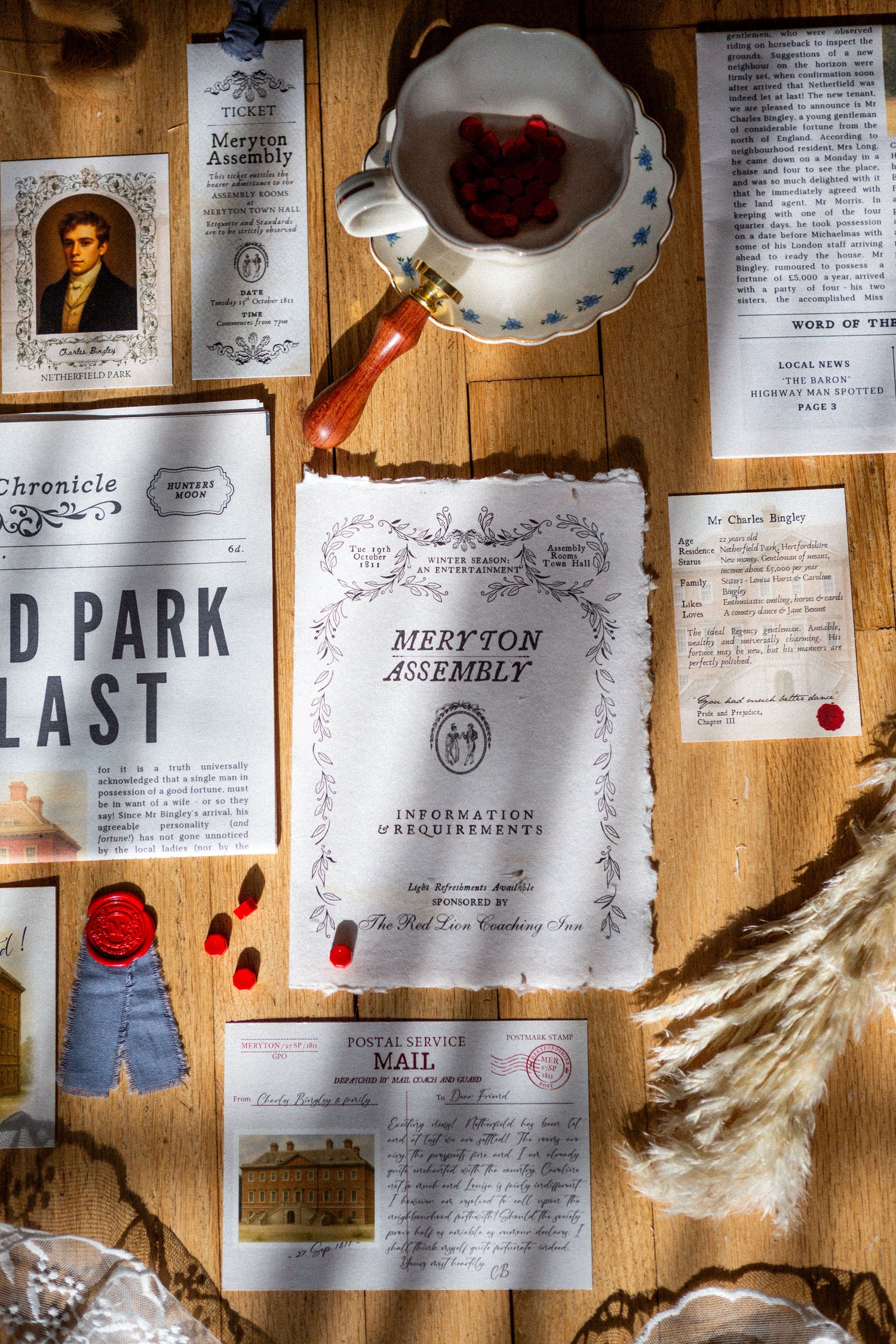 The Meryton Chronicle is a letterbox experience, where each dispatch takes the form of a Regency themed newspaper inspired by Jane Austen’s Pride and Prejudice. Each issue is printed on authentic 60gsm improved newsprint and delivered as though straight from the parlours of bon ton society.